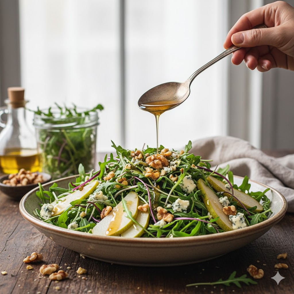 🥗 Rukolový klíčkový salát s hruškou, vlašskými ořechy a medovým dresinkem